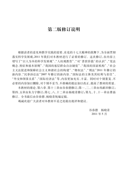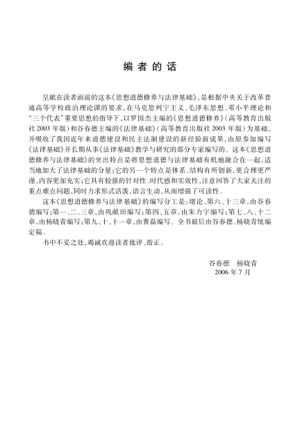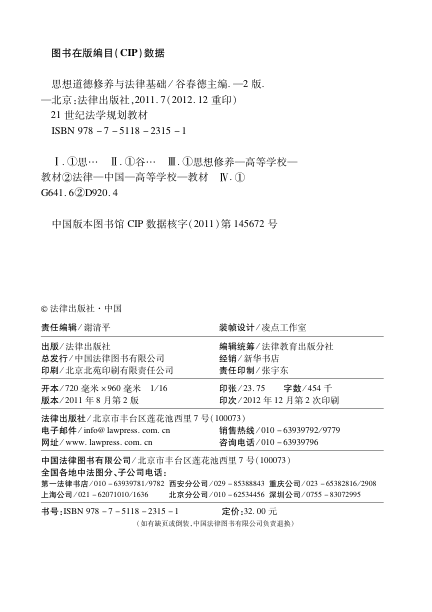 本书是面向高校学生的通识类思想政治与法律基础课程教材,由中国人民大学谷春德教授主编,集结多位法学专家共同编写。作为“21世纪法学规划教材”系列之一,本书在保持思想道德修养与法律知识融合特色的基础上,强化了法律部分的系统性与时代性。内容涵盖科学发展观、人权观、宪法原则、物权法、刑法与民事诉讼法最新修订内容,以及国际法相关主题,体现较强的现实回应性与教学实用性。结构严谨,语言生动,兼具理论深度与可读性,适合高校师生及关注公民素养教育的读者参考使用。