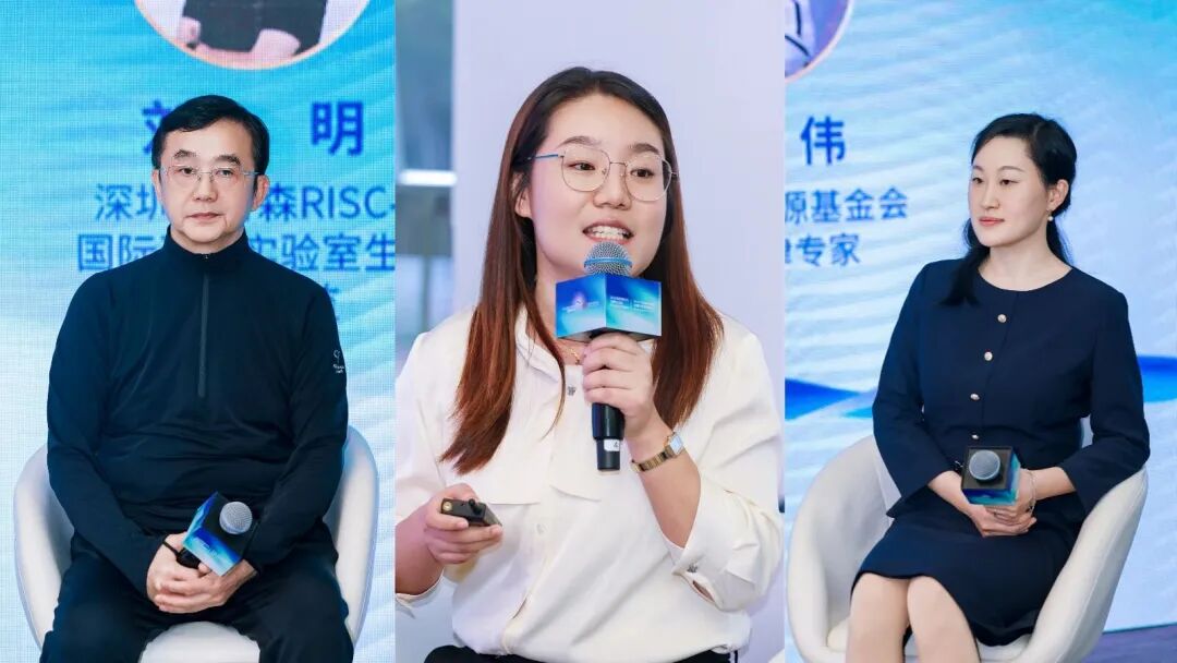 从左至右分别为 :深圳帕特森RISC-V国际开源实验室生态运营总监刘明、京东云、软件工程和智能体应用负责人郑伟娜、开放原子开源基金会资深法律专家、北京大学国际法学院2008级校友刘伟