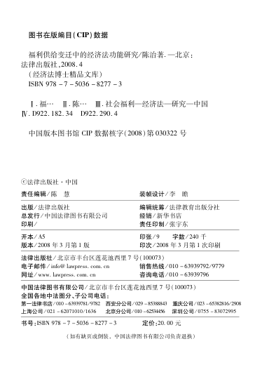 这是一部扎根中国现实、具有鲜明问题意识的经济法理论专著。作者陈治以‘福利供给变迁’为切口,系统探讨经济法在社会再分配与国家治理转型中的双重功能——既承担利益配置的调控使命,又发挥社会整合的粘合价值。全书六章层层递进:从福利概念的跨学科梳理,到福利供给模式的历史演进;从经济法功能的理论定位与生成逻辑,到其内在限度与实现路径,展现出扎实的法学功底与开阔的社会科学视野。作为《经济法博士精品文库》之一,本书成稿于2008年,但其对政府角色、市场边界、法律功能限度等命题的思考,对理解当下社会保障法治化、共同富裕制度建构仍具启发意义。