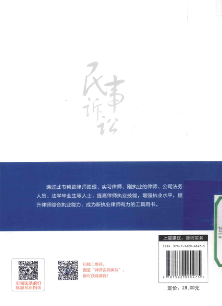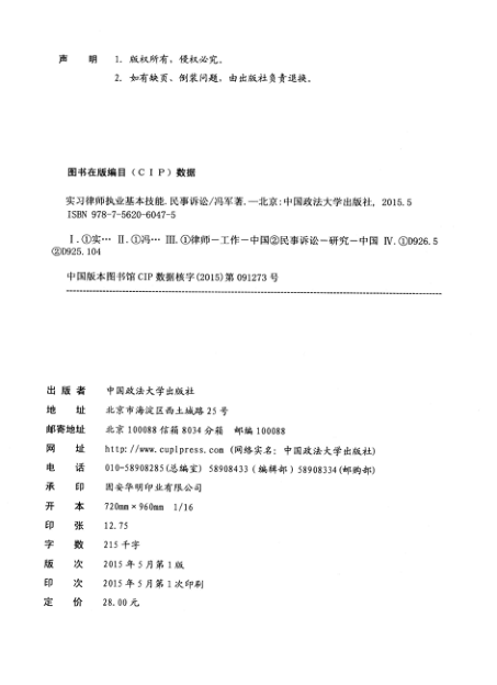 这是一本专为实习律师和初执业律师打造的民事诉讼实操手册。全书紧扣诉讼流程,从法律咨询、接受委托,到起诉应诉、庭审参与、举证质证、上诉执行乃至再审申请,八章内容环环相扣,覆盖普通民事案件代理的完整生命周期。语言平实、步骤清晰,强调‘一书在手即可独自办案’,真正实现法学理论向执业能力的转化。由资深律师冯军撰写,金鹏教育组编,中国政法大学出版社2015年出版,兼具教学规范性与一线可操作性,也适合作为法学院实务课程参考用书或法律爱好者自学入门读物。