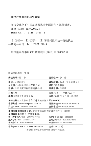这是一部立足中国现实、放眼全球视野的反垄断法专题研究著作。作者郗伟明博士在《反垄断法》颁布初期(2008年施行)即展开系统性思考,紧扣‘经济全球化’与‘中国转型’双重背景,深入剖析反垄断执法的指导思想、制度困境与本土化路径。书中不仅梳理了反垄断法基本原理与历史脉络,更对行政垄断规制、宽恕制度、承诺制度、适用除外及域外管辖等关键议题展开比较分析,并特别关注知识产权滥用与执法协同等前沿问题。文字理性扎实,案例意识与政策敏感度兼备,既有法学理论深度,又具实务参考价值。对于法学研究者、市场监管从业者及关注竞争政策的读者而言,本书是理解中国反垄断执法起步阶段逻辑与挑战的重要窗口。