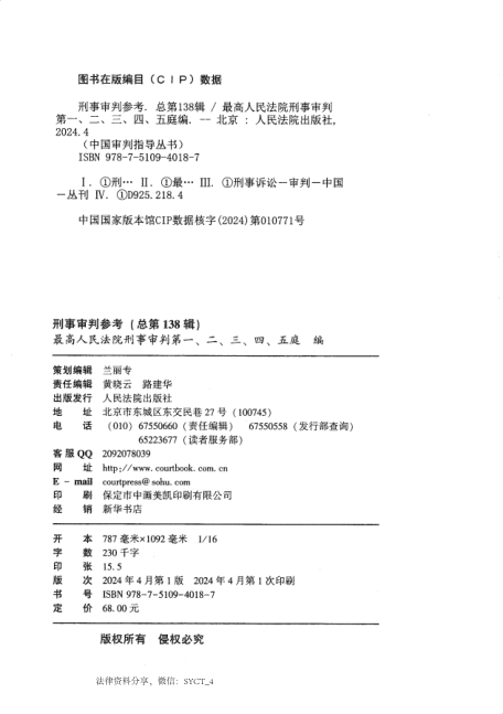 📚《刑事审判参考》是由最高人民法院刑事审判第一至第五庭联合编纂的权威实务指导丛书,本辑为总第138辑(2023年第2辑),2024年4月由人民法院出版社正式出版。全书涵盖最新典型刑事案件的裁判要旨、法官评析与法律适用解析,内容紧扣司法实践难点,如新型犯罪认定、证据审查标准、量刑规范化等,兼具理论深度与操作指引性。OCR识别版便于检索与引用,是法官、检察官、律师及法学研究者不可或缺的案头工具书。专业、务实、及时——一册在手,把握刑事司法前沿动态。