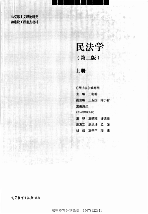 📚 这是教育部组织编写的‘马工程’重点教材《民法学》第二版上册,由王利明教授主编,汇聚王卫国、陈小君、王轶、程啸等国内顶尖民法学者共同编写。全书以《中华人民共和国民法典》为根本遵循,系统阐释民法基本原理与制度体系,兼具理论深度与教学实用性。