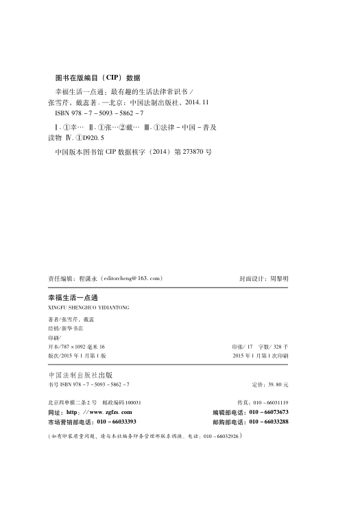 📚这本由张雪芹、戴荒(注:内容片段中‘藏燕’疑为‘戴荒’笔误)合著的普法读物,以轻松幽默的笔调切入普通人最关心的法律场景。全书按‘衣食住行’‘婚姻家庭’等生活模块编排,第三章即聚焦‘居者有其屋’,直击租房、买房、物业等高频痛点。没有晦涩法条堆砌,而是用真实案例+简明解析,把《民法典》相关精神转化为可操作的生活建议。2015年首版,由中国法制出版社出品,兼顾权威性与可读性,适合想避开法律坑、又不想啃大部头的上班族、新婚夫妇和居家一族。39.8元定价,堪称高性价比入门之选。