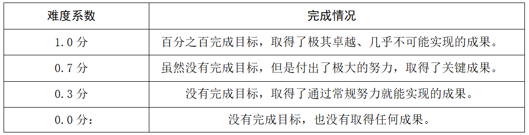 根据前文所述的评分规则打分,即有利于组织领导客观判断组织成员的工作成果,客观评价成员工作成绩;同时也有利于组织领导、组织成员对下一次OKR的设立形成预判,如果关键成果大多数得分都在0.9分以上,就意味着目标设定过低,成员工作潜力没有充分挖掘;如果大多数得分都在0.3分以下,意味着目标设定过高,长期不达标容易打击成员积极性。