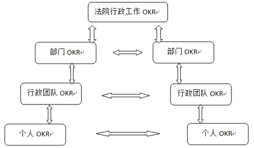法院司法行政人员借鉴OKR绩效管理机制,是一项创新管理的大胆尝试。但毕竟OKR绩效管理机制兴行于企业管理,要在法院管理中运用这一机制,必须立足法院行政工作实践,甄别适用,以防生硬照搬导致水土不服。鉴于此,本文对我国法院行政绩效管理机制作如下设计: