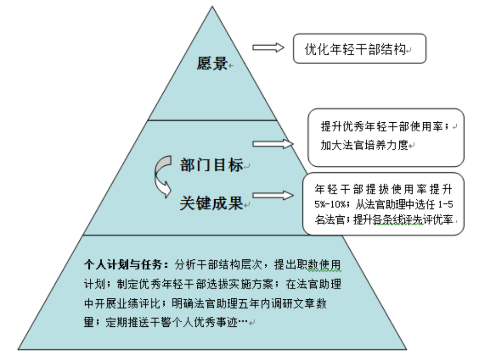 示例1:法院在年度目标中提出愿景:优化年轻干部结构。为实现这一目标,政治部作为职能部门提出部门目标:提升优秀年轻干部使用率;加大法官培养力度;进而明确要得到关键结果:年轻干部使用率较上年提升5%-10%;遴选初任法官1-10名;提升条线评优率等。在对照预期要得到的关键结果,明确工作人员的计划与任务:如有的要分析干部结构层次、提出使用计划;制定优秀年轻干部选拔事实方案;法官助理中开展业绩评比等。明确上述法院、部门、个人的目标、关键结果后,再按照时间节点推进工作,并按照关键结构的完成质量评估个人工作质量。