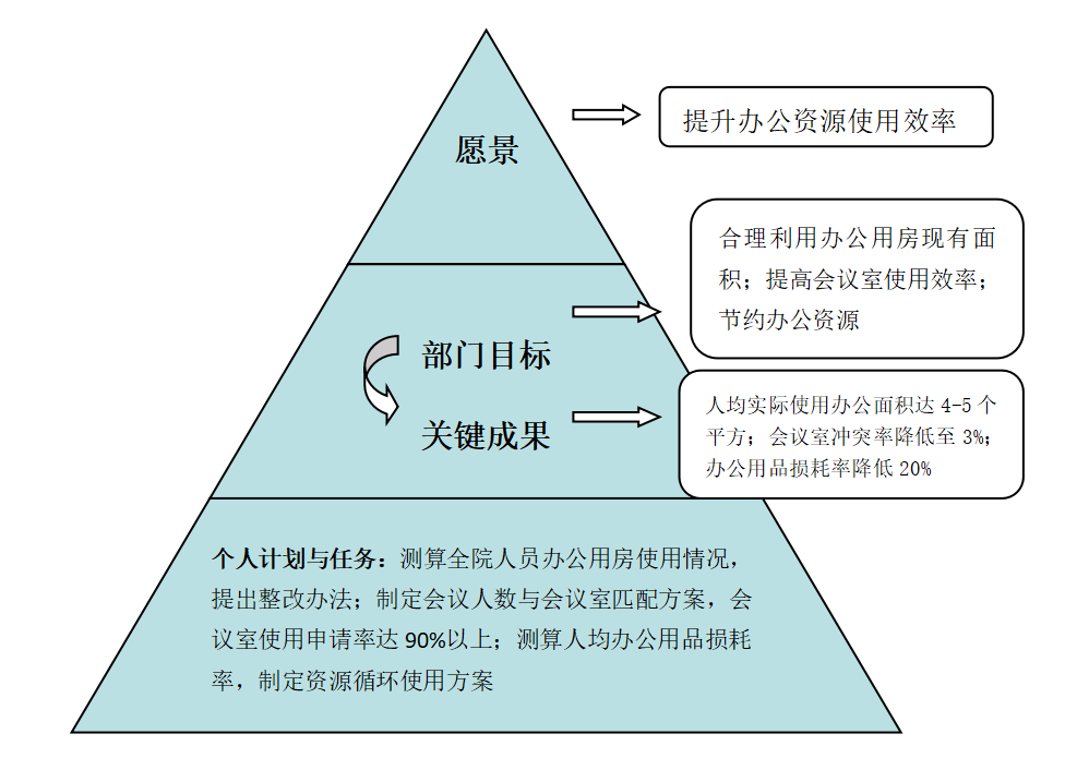 示例二:法院在年度目标中提出愿景:提升办公资源使用效率。为实现这一目标,办公室作为职能部门提出部门目标:合理利用办公用房现有面积,提高会议室使用效率,节约办公资源;进而明确要得到关键结果:人均实际使用办公面积达4-5个平方;会议室冲突率降低至3%等,办公用品损耗率降低20%等。再对照预期要得到的关键结果,明确工作人员的计划与任务:如测算全院人员办公用房使用情况;制定会议人数与会议室匹配方案,会议室使用率90%以上;测算人均办公用品损耗率,制定资源循环使用方案等。明确上述法院、部门、个人的目标、关键结果后,再按照时间节点推进工作,并按照关键结构的完成质量评估个人工作质量。