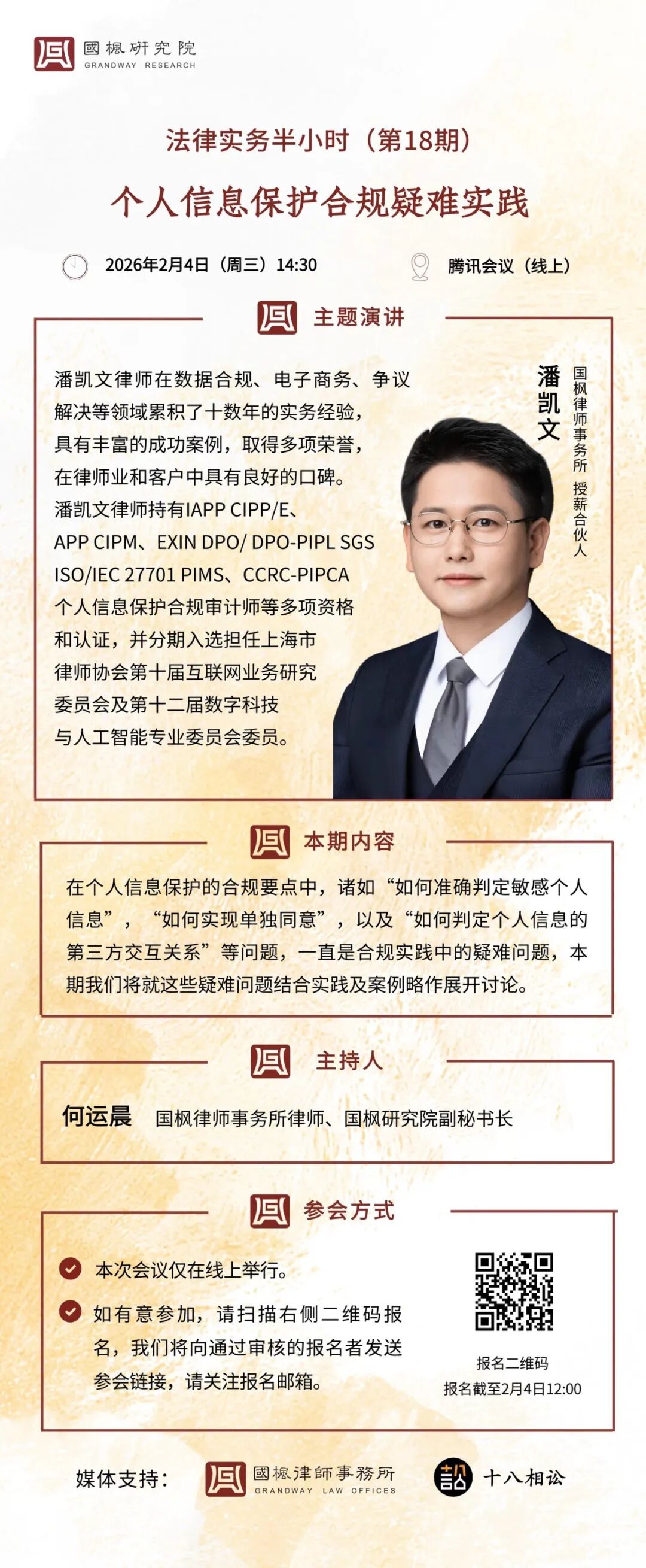 法律实务半小时——数据合规专题系列 ,将试从数据合规制度体系入手,进而以企业较为关注的个人信息保护、数据交互、人工智能数据安全、数据出境等维度展开与大家进行深入探讨交流。 第三期数据合规主题为《个人信息保护合规疑难实践》 。