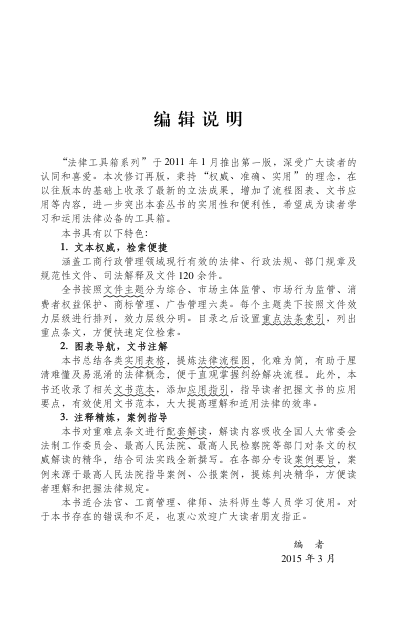 📚这是一本专为实务工作者打造的高密度法律工具书——第3版全面更新至2015年,系统整合工商行政管理领域120余件现行有效法规文件,涵盖综合、市场主体监管、市场行为监管、消费者权益保护、商标与广告管理六大板块。全书以‘权威+实用’为内核:✅ 权威文本按效力层级编排,配重点法条索引,检索高效;✅ 流程图表化繁为简,厘清执法/诉讼关键路径;✅ 文书范本附应用指引,即查即用;✅ 案例要旨精选最高法指导案例与公报案例,直击裁判要点;✅ 条文解读融合全国人大法工委、两高权威释义。适合法官、市场监管人员、执业律师、企业法务及法学师生日常办案、教学与备考参考。