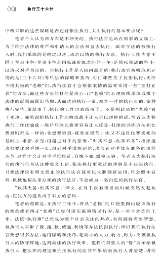 这是一本极具现实张力与思想穿透力的实务类法律读物——作者白建永法官扎根执行一线多年,敏锐发现《三十六计》等古代兵法中蕴含的辩证思维、谋略逻辑与心理博弈智慧,竟能精准映射法院‘执行难’中的真实困境:老赖躲、拖、赖、骗,执行干警如何既坚守‘依法执行、文明执行’底线,又善用‘势’‘知’‘谋’‘合’破局?书中没有空谈理论,而是以‘瞒天过海’对应执行线索隐蔽调查,以‘攻其不备’指导突击查控,以‘不战而屈人之兵’倡导沟通感化优先……每计皆有原文释义、执行场景还原与实操反思。它不是教人‘耍滑头’,而是教人在法治框架内更聪明、更有力、更有温度地兑现公平正义。