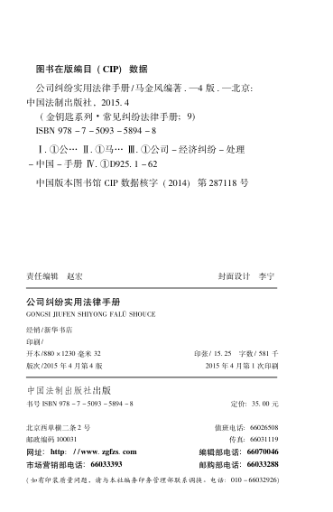 📚 这本《公司纠纷实用法律手册》(第4版,2015年出版)是‘金钥匙系列·常见纠纷法律手册’中聚焦公司领域的重要分册。全书立足中国现行法律法规体系,系统梳理公司设立、治理、股权、解散清算等全流程中高频发生的纠纷类型,配套收录法律条文、司法解释、部门规章及权威批复复函,并辅以典型案例、疑难问题解析与常用文书模板。