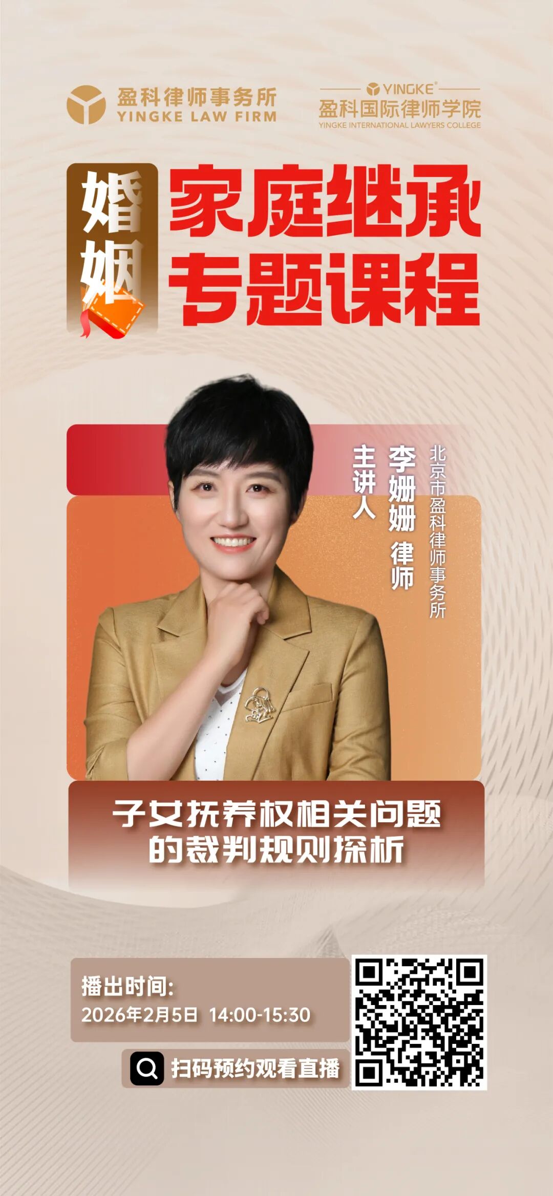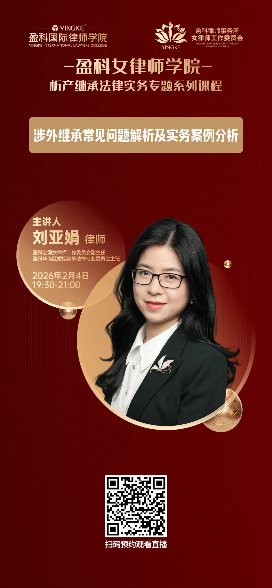 主讲人介绍:刘亚娟律师,先后荣获盈科2022年度“盈科全国优秀女律师”“优秀民事律师”、2023年度“优秀民事律师”、2024年度首届“盈科百名优秀女律师”“律政巾帼”“领军人才”、2025年度“领军人才”称号。执业以来已累计为客户提供数千起法律咨询,并已成功办理近千起涉及婚姻、继承、房产类的诉讼及非诉案件。