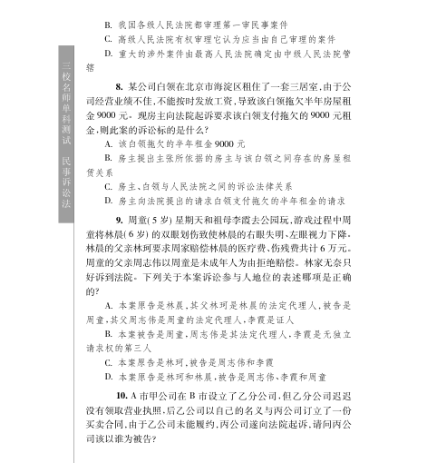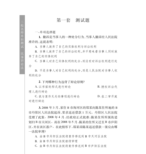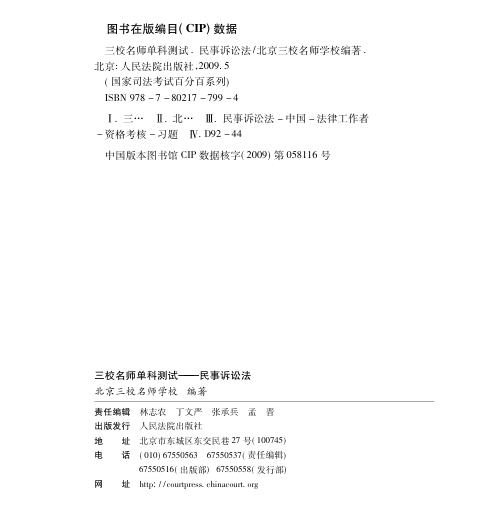 📚专为国家司法考试备考打造的《三校名师单科测试·民事诉讼法》是‘国家司法考试百分百系列’重要组成部分。本书由北京三校名师学校权威编著,紧扣大纲与实务,以高质量单科测试题为核心——含大量典型单项选择题,覆盖管辖、当事人、诉讼参加人、辩论原则、撤诉效力、级别管辖、诉讼标的等民诉重点难点,题干设计严谨,选项辨析清晰,解析逻辑扎实。