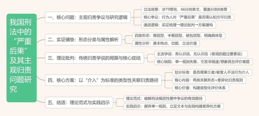 为破解这一难题,论文构建了“实证梳理—理论批判—方案建构”的清晰递进逻辑:先通过梳理“严重后果”的规范属性(形态、属性)打破同质化认知,为后续归责研究提供事实支撑;再针对性批判传统单一归责学说(有认识说、无认识说)的局限,凸显新方案的必要性;最终提出以“介入”为核心标准的类型性关联归责路径,既回应理论争议,也为司法实践提供可操作指引。这种递进逻辑的价值在于,避免脱离立法实际空谈理论,确保归责方案始终锚定规范本身的多样性。