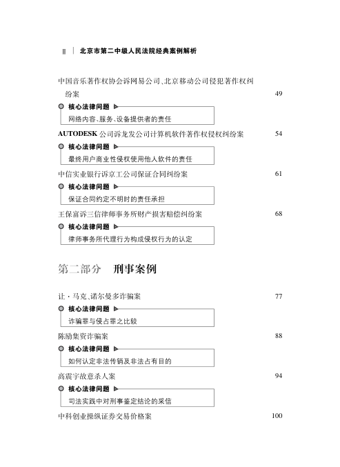 📚 这是一本由北京市第二中级人民法院权威编著的实务型案例汇编,精选2002年以来被《最高人民法院公报》收录的9篇指导性案例,以及《中国审判案例要览》刊载的53篇深度分析,覆盖刑事、民商事、行政、知识产权四大领域。书中既有轰动全国的标志性案件(如‘中科创业操纵证券案’‘乌苏里船歌著作权案’),也聚焦‘职务便利认定’‘最终用户软件侵权’‘保证合同责任边界’等高频实务难点,每案均提炼‘核心法律问题’,兼具裁判参考价值与法学教学意义。出版于2007年,虽年代稍早,但所涉法律原理、证据逻辑与裁判思路至今仍具高度借鉴性,是法官、律师、法学生理解司法实践与法律适用落地的重要窗口。