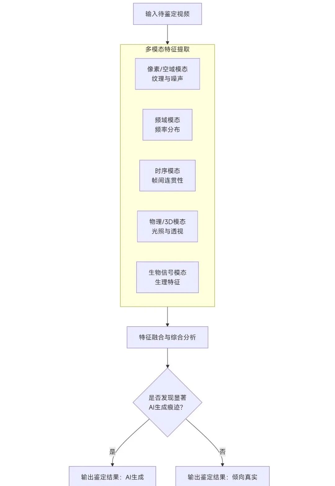 (2)模态分析。模态分析可以理解为AI对“违和感”的数据分析方式。比如Sora2模型经常会出现画面某些地方突然模糊的情况,这就是频域模态不真实的特征。真实图像的频率分布自然,而较为落后AI生成的图像在特定频带可能出现异常能量分布。其他的模态比如像素模态,用来分析单帧图像纹理、边缘与噪声,可以用来检测皮肤毛发是否自然;时序模态,可分析帧与帧之间的连贯性;物理几何模态,通过算法去检查光源方向与透视关系等。