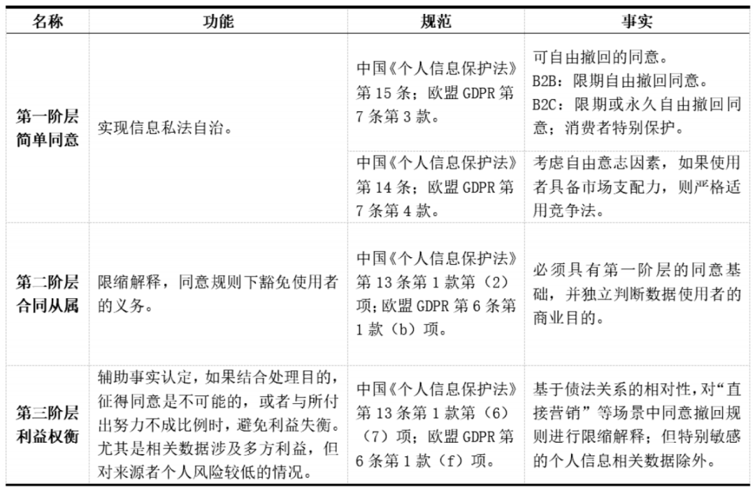 有观点认为,应当不惜一切代价避免将个人信息相关数据称为对价。个人数据与基本权利紧密相关,不能被视作一种商品,也无法被等同于价格或金钱。欧盟《数字内容指令》部分采纳了欧洲数据保护监督官的意见,根据第3条,个人数据不等同于商品。虽然第3条第1款的措辞有所调整,区分了数字内容与个人数据,但消费者提供个人数据的情形仍然涵摄于该指令。法秩序应当采取系统性的思维确定法律概念,将数据提供行为理解为一种合同义务,并且债权人不能强制这个义务的履行。从解释论来看,将提供数据的积极或消极行为作为给付义务,并不会直接产生将人格要素物化的问题,正如人格权益可以通过商品化路径衍生出受到法律保护的财产性权益,但不会产生可交易的肖像、姓名、声音客体。正是由于“承诺”表述的模糊性,欧盟各国可以通过国内立法确定个人数据作为“给付”时的法效果,从而决定许可事实的第三阶层效力。我国法律规范对此问题尚无明确规定,但可以通过《民法典》和《个人信息保护法》规范的体系解释实现第三阶层效力。第一,《民法典》宣示的“个人信息权益”包含双重意涵,来源者的人格权附属财产利益可以为第111条所涵摄而非第1034条。《民法典》第111条与第1034条的第一句都规定了“个人信息受法律保护”,追求提取公因式技术的《民法典》在总则编和人格权编进行一字不差的重复并非冗余,而是体现出开放性,给予来源者获得经济补偿的第三阶层财产权解释空间。第二,《个人信息保护法》第44条采取直接确认“知情权、决定权”的立法用语,这是其外延最广、解释空间最大的权利性立法表述,具有纲领性的作用,该法其他各个权利条款都可以归入“决定权”的解释空间,同样存在第三阶层新型财产权利的解释和发展空间。