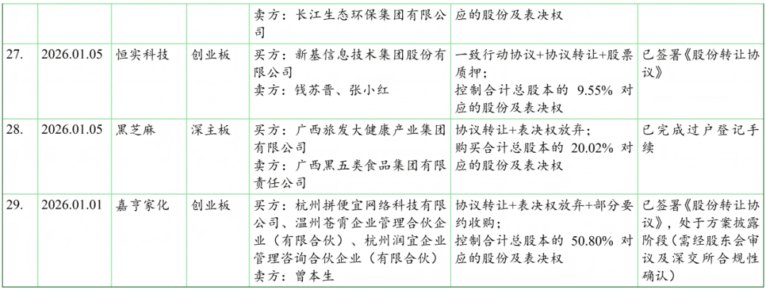 我们在见微数据库中,以“控制权”为关键词、按照最新公告日设定检索周期为2026年1月1日至1月31日。检索结果显示,期间共有约40家上市公司发布了63份涉及控制权交易(含交易进展)的公告。剔除一致行动协议(表决权委托协议)解除、无偿划转、司法拍卖等非交易性的因素导致的控制权变动,以及已公告终止的交易后,剩余仍在推进中且已披露交易方案的控制权交易涉及约30家上市公司,基本信息如下表: