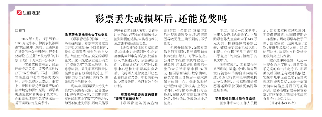 陈燕红律师 提醒,从公平与安全的角度出发,彩票实物系兑奖的唯一法定凭证。彩票丢失后因缺乏有效兑奖依据,实践中几乎无法兑奖;而彩票损坏后能否兑奖,取决于票面关键中奖信息是否仍可正确识别。购彩者唯有妥善保管彩票,方能在幸运降临时依法享有并守住中奖权益。