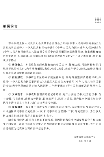这本由法律出版社法规中心编撰的《新编婚姻家庭法律手册》,立足2011年前现行有效法规(含《婚姻法》《收养法》《未成年人保护法》《继承法》及配套司法解释等),系统整合婚姻、家庭、收养、抚养、继承、遗赠及纠纷解决全链条内容。全书四大亮点清晰实用:①分类汇编权威法律规范;②精选常见纠纷案例并附精要评析;③提供离婚申请、遗嘱、调解协议、起诉书等高频文书范本;④附一审/二审民事诉讼流程图,助力普通人理解程序路径。虽出版于2011年,但作为基础性实务手册,对理解婚姻家事法律逻辑与操作要点仍具参考价值。