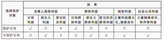 在北雁云依案中,父母遵从自己的爱好,从为新生儿的姓名选取中获得快乐的利益。但是这种采取第三姓的姓名选取方式与传统习惯不符,可能给子女带来不利后果。父母为新生儿选取姓名,应当遵守监护制度的监护义务,避免给新生儿带来不利益。利益衡量的结果可以用下面的表格展示出来: